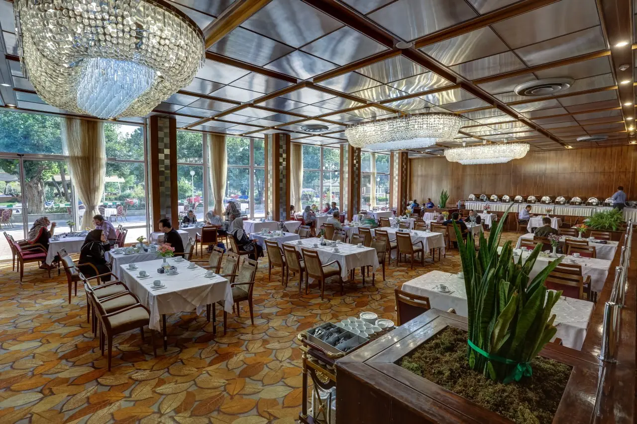 رستوران گل سرخ: صبحانه از ساعت ۷:۳۰ تا ۱۰ و منوی کامل ایرانی و فرنگی همراه با فضای باز.