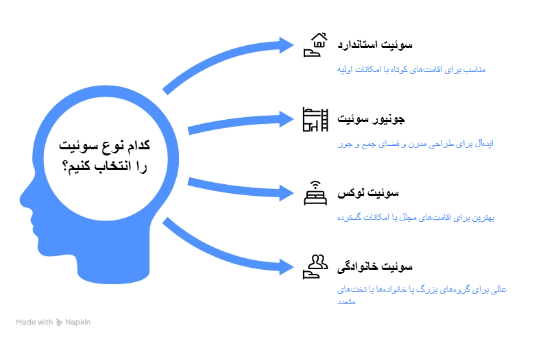 - سوئیت خانوادگی: طراحی شده برای اقامت چند نفره و دارای تخت های بیشتر.